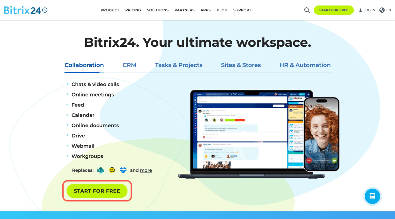 Go to the Bitrix24 site and click Start for free.